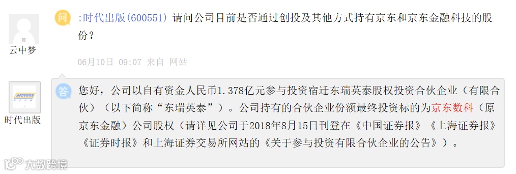 时代出版以自有资金1.378亿元参与投资宿迁东瑞英泰股权投资合伙企业(有限合伙),东瑞英泰目前持有京东数科1.44%股份。