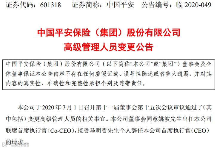 7月1日,中国平安召开第十一届董事会第十五次会议,会议决议:为配合公司战略转型升级需要、加强“执行官+矩阵”集体决策机制,聘任姚波出任公司联席首席执行官(Co-CEO)。同时,中国平安董事会同意马明哲个人提出的辞去首席执行官职务的请求。辞任首席执行官后,马明哲继续担任董事长。