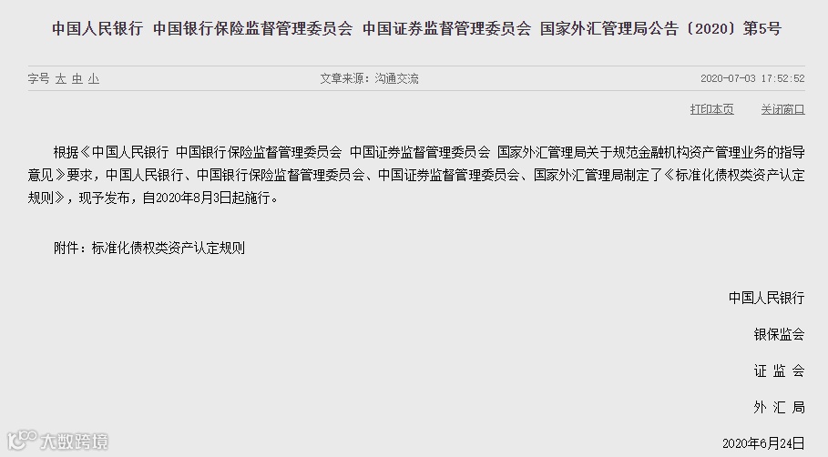 央行网站3日消息,中国人民银行会同中国银行保险监督管理委员会、中国证券监督管理委员会、国家外汇管理局正式发布《标准化债权类资产认定规则》(下称《认定规则》),自2020年8月3日起施行。