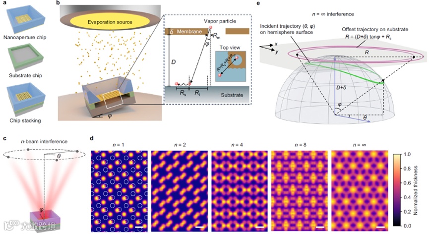 近日,苏黎世联邦理工学院的Chih-Jen Shih教授,探索了一种基于分子束莫尔干涉的概念,用于直接对由任何可蒸发材料(例如金属、氧化物和有机半导体)制成的复杂三维表面进行图案化。作者提出的方法称为分子束全息光刻 (MBHL),它依赖于对穿过叠加在基底上的纳米孔径的材料通量的角度投影进行精确控制,模拟干涉光刻中相干激光束的干涉。结合计算光刻 (CL) 算法,已演示了多种材料图案的自对准叠加,从而产生二元至五元超晶格,其临界尺寸和叠加精度分别约为 50 纳米和 2 纳米。该工艺有望大幅拓展材料组合的边界,从而实现在任意基底上高通量制造平移对称复杂超结构,从而实现新兴的纳米成像、传感、催化和光电器件。相关工作发表在《Nature Communications》上。(刘帅)