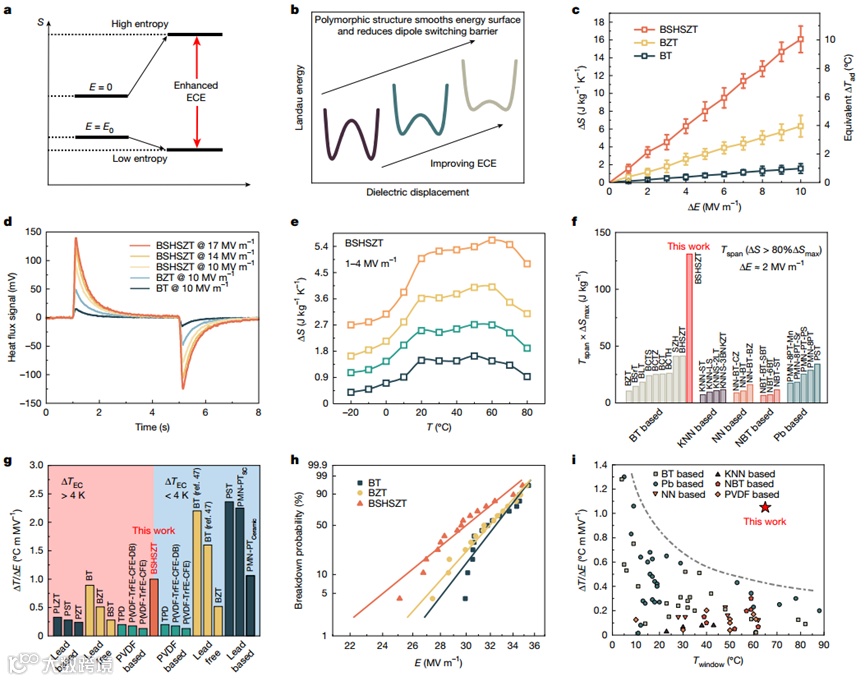上海交通大学钱小石教授、澳大利亚伍伦贡大学张树君教授成功设计并制备出一种全新的无铅钙钛矿基铁电陶瓷——(Ba₀.₈Sr₀.₂)(Hf₀.₀₂₅Sn₀.₀₂₅Zr₀.₀₂₅Ti₀.₉₂₅)O₃(简称BSHSZT)。这一材料通过对A位与B位的精细多元素替换,有效地打破了传统铁电陶瓷中极性域的长程有序性,使得极性团簇由原有的数百纳米级别分解为仅1~5个晶胞大小的超细颗粒,并在其内部形成多种共存的局部结构(包括四方、斜方、菱形及立方等相),从而大幅提升了体系的极化熵。实验结果显示,在10 MV m⁻¹的电场作用下,BSHSZT所实现的电致热熵变化高达15.0 J kg⁻¹ K⁻¹,相当于产生约10 K的绝热温度变化,这一效果比未经过元素替换处理的纯BaTiO₃提升了10倍以上,同时其ECE响应在宽温区间(超过60 °C)内均表现出优异的稳定性。此外,该材料在多层陶瓷电容器(MLCC)结构中同样展现出卓越的低电压驱动能力和长期循环稳定性(1 MHz循环后性能衰减不足3%),充分证明了其在固态电致热制冷器件中的应用潜力。相关内容发表在《Nature》上(张琰炯)。
