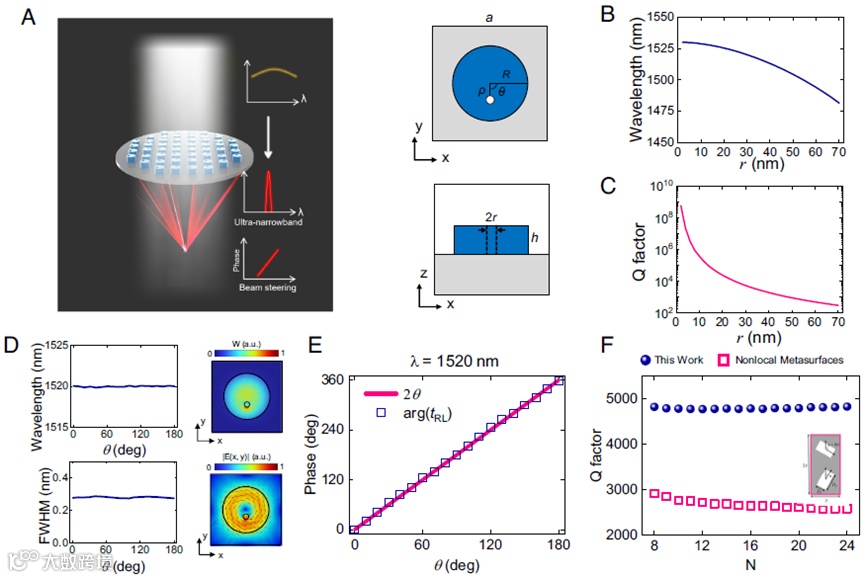 众所周知,物理系统沿闭合轨迹进行绝热变换时会获得几何相位。这一发现推动了凝聚态物理、量子力学、粒子物理甚至宇宙学的重大进展。几何相位是纳米光子学中波前整形方法的基础,并引发了超表面研究的爆炸式增长。近年来,下一代信息技术对光学信息操作的容量和保密性提出了更高的要求。因此,多维复用成为进一步提高超器件性能的理想方法。该策略在极化、自旋和轨道角动量等多个维度的探索中取得了巨大成功。然而,它在最关键的维度,即工作波长,面临着严峻的挑战。挑战源于一般几何相位的局域视角。在相位梯度超表面中,光场被严格限制在每个超原子内,因此带来了宽带波前变形。窄带操作主要依赖于相邻相互作用,代价是波前的空间操控。尽管非局域超器件不断取得突破,其性能在很大程度上依赖于每个超原子的微调。例如,实验证明,数值孔径(NA)为0.2的非局域超透镜的质量因子(Q)仅为89。这样的Q值适用于增强现实(AR)显示等应用,但严重限制了非局域超表面在主动、非线性和量子应用中的巨大潜力,因为这些应用需要强的光-物质相互作用。到目前为止,同时产生具有像素级变化和超窄带宽的几何相仍然是一项看似不可能完成的任务。