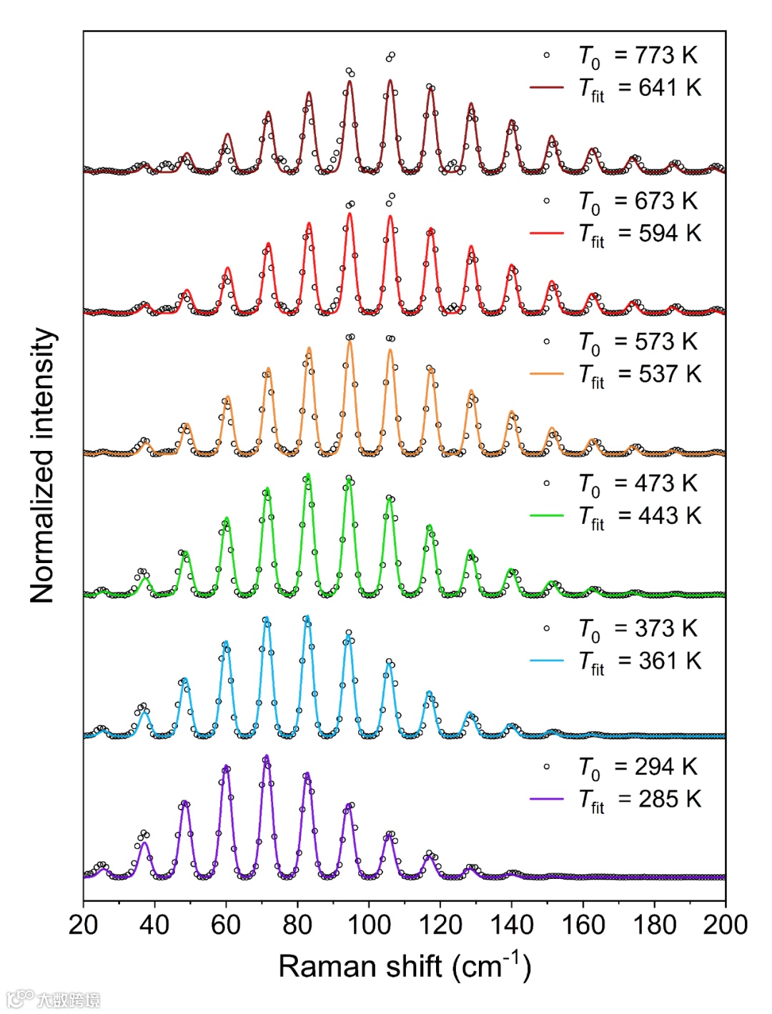 图2. 不同温度下测量的相干转动拉曼光谱(黑色圆圈)和最佳拟合光谱(实线)