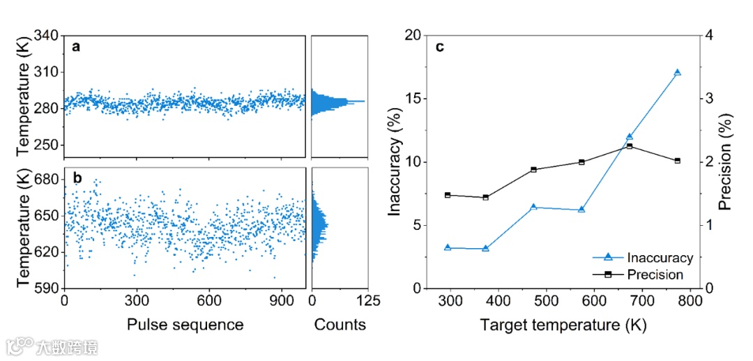 图3. 单发次、单光束相干转动拉曼测温仪在室温(294 K)和高温(773 K)条件下获得的1000帧单次测量结果及其在不同温度下测量的不准确度和精度
