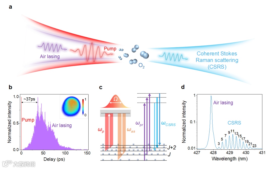 空气激光是以空气的主要成分或其衍生物为增益介质,以高能量飞秒激光诱导的低温等离子体通道为载体,通过无腔放大产生的相干辐射,具有高亮度、窄线宽、沿特定方向传输等优点。因此,自从空气激光被发现以来,其在大气遥感、同位素分析、燃烧诊断等领域的应用就引起了国内外研究者的极大关注。最近,中国科学院上海光机所强场激光物理国家重点实验室研究团队和代尔夫特理工大学等单位合作,利用空气激光独特的时频特性,发展了单光束、高帧频相干拉曼测温技术,在1 kHz帧频实现了单发次、单光束相干转动拉曼光谱测温,测量精度达到<2.3%的水平。