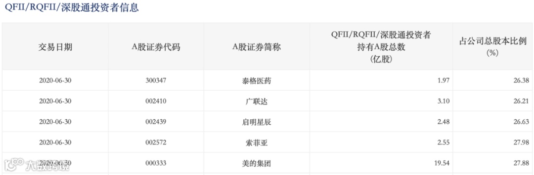 根据深交所披露信息,索菲亚之外,美的集团、泰格医药、广联达、启明星辰等外资持有比例均超过26%。