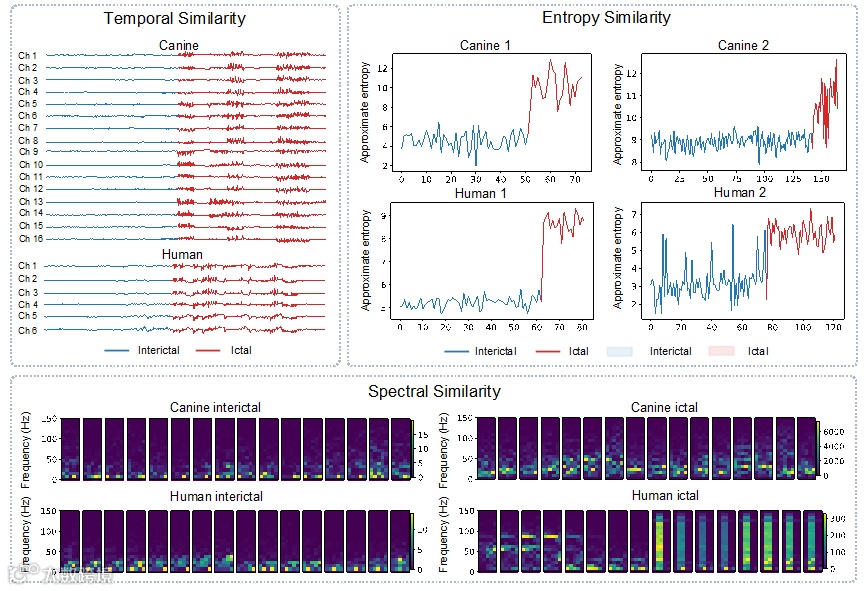 研究团队分析了犬类与人类EEG信号的跨物种可迁移性,发现两者在癫痫发作期间具有相似的电生理模式,如图2所示: