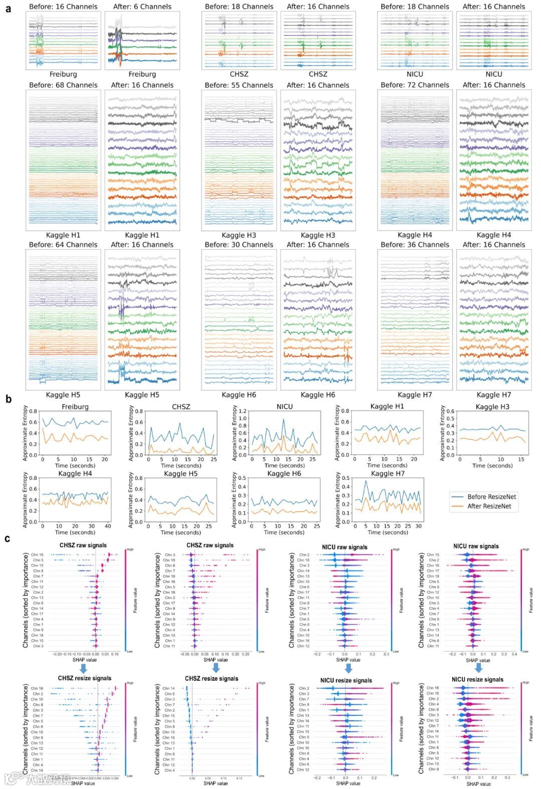 在四个临床EEG数据集(Kaggle、Freiburg、CHSZ、NICU)上验证了ResizeNet+MSA方法的有效性: