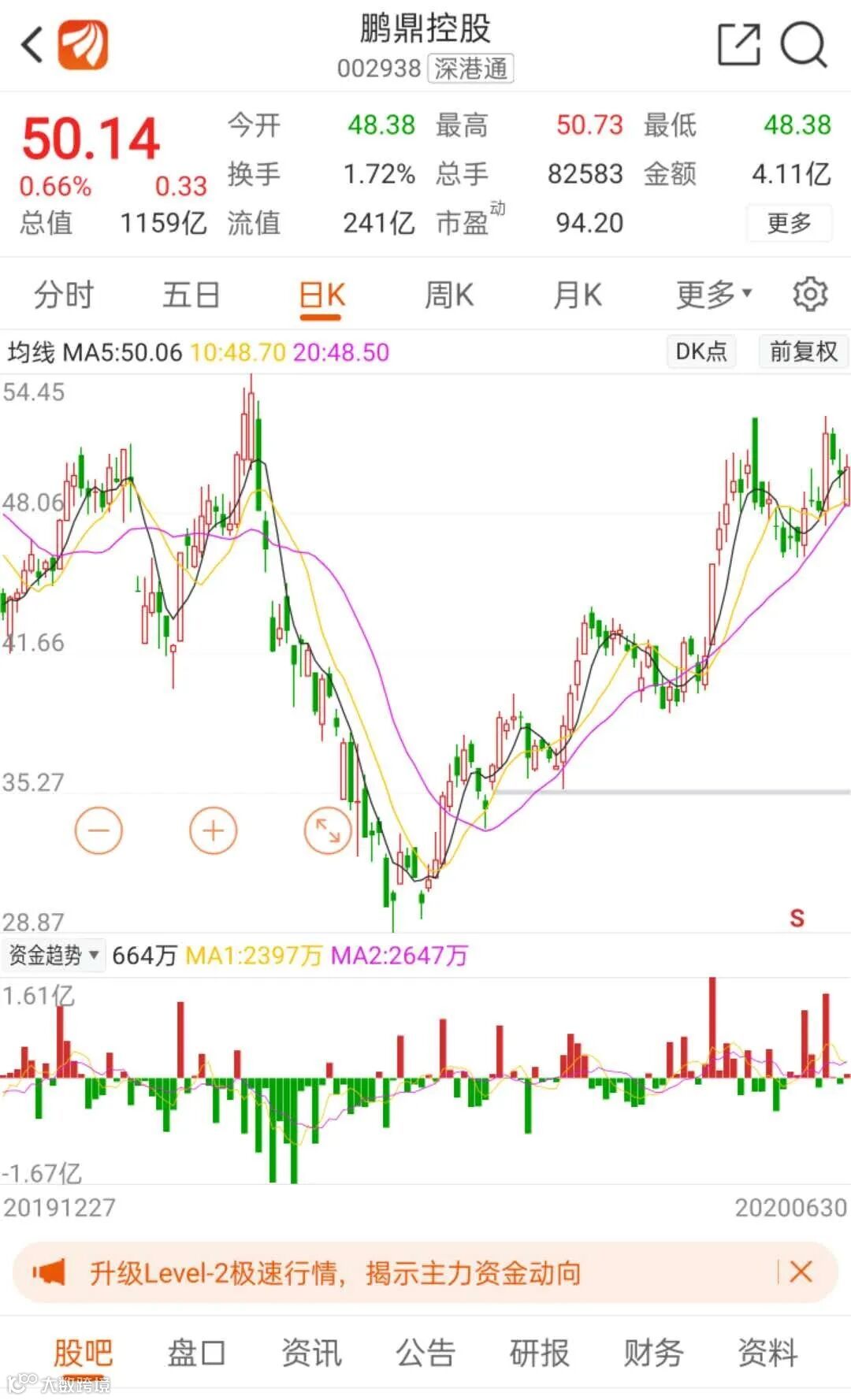 虽然遭遇利空消息,但6月30日早盘,受益于消费电子板块大涨影响,鹏鼎控股午盘收涨0.66%,报50.14元,市值1159亿元。