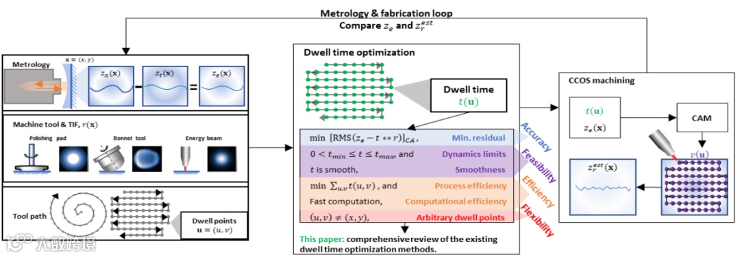 在计算机控制光学表面加工过程中(图1),一个可靠的驻留时间解决方案对表面生成的准确性和收敛性至关重要。它引导机床在光学表面上的运动,以确定性地纠正图形误差。然而,由于驻留时间优化本质上的不适定性,其解决方案具有多样性和非唯一性,给优化过程带来了挑战。