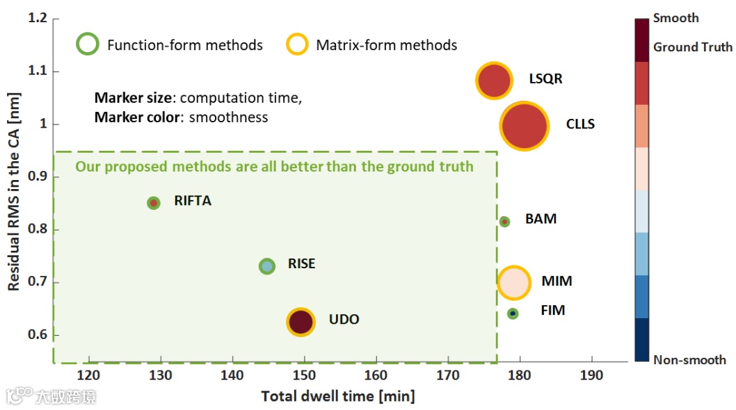 为验证论文总结出的关系和实现方法的有效性,研究团队从四个方面:表面残差、解的光滑度、整体驻留时间和计算时间,比较了论文中所提到的方法(图3),发现RIFTA、RISE和UDO三个算法为驻留时间优化方法的首选。