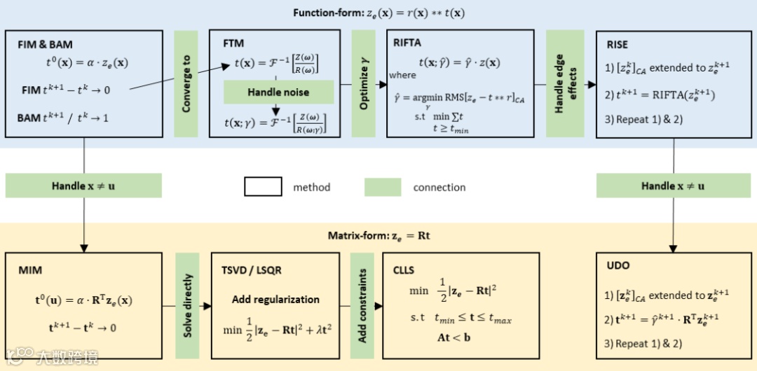 为了应对这些挑战,研究人员采用了多种方法,包括迭代法、贝叶斯法、傅里叶变换法和矩阵形式法。这些方法旨在最小化计算误差,确保正值,减少处理时间,并允许灵活的驻留位置。研究团队系统分析了这些方法的特点,首次揭示了这些方法之间的内在区别与联系(图2),并依据这些发现,给出了各种方法的高效实现策略。