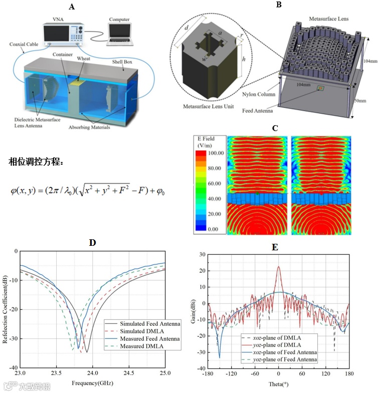 图1 (A)含水量检测系统示意图。(B)超材料透镜天线和单元结构。(C)超材料透镜天线调控相位电场图。(D)超材料透镜天线和馈源天线反射系数。(E)超材料透镜天线和馈源天线增益方向图。