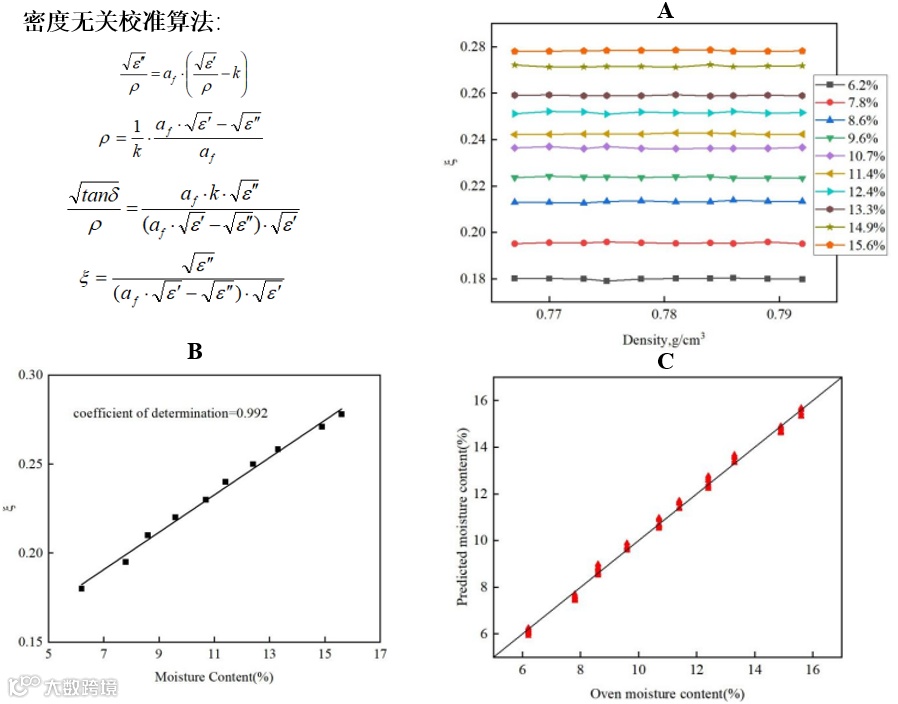 为了减少密度对检测精度的影响,本研究分析了介电常数平方根、损耗因子平方根、损耗正切和密度之间的关系,提出了密度无关校准算法。图4(A)中显示了十种含水量下密度因子ξ与密度之间的关系。可以看出密度因子ξ随水分含量的增加而增加,但不受密度的影响。这一结果表明,在预测小麦含水量的实验中,ξ能有效减小密度的影响。根据小麦水分含量和ξ之间的线性关系,拟合了线性回归方程,判定系数R2为0.992。图4(C)显示了在10个含水量(6.2% 至 15.6%)条件下预测结果与直接干燥法结果的比较。可以看出,数据点集中在一条直线上,预测结果的均方根误差(RMSE)和平均绝对误差(MAE)分别为0.178%和0.143%。