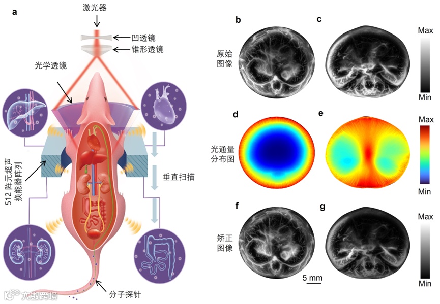 为了验证该技术的有效性,研究团队对临床药物米托蒽醌(Mitoxantrone)的清除路径进行了深入研究,并针对代谢过程进行了高时空分辨三维成像,对于环形超声阵列PACT的三维成像,该方法利用合成孔径聚焦技术(Synthetic Aperture Focusing Technology,SAFT)解决了远离焦点区域的失焦问题,并且分离小鼠三维数据中低频信号来对药物代谢信息进行准确、快速显影(图2所示)。研究结果清楚地显示,在正常情况下,米托蒽醌主要经肝脏代谢,少量通过肾脏清除。而当肝功能受损时,肝脏的代谢能力显著降低,药物的半衰期大幅延长,表明该药物在肝脏受损时清除效率显著下降。在这一发现为临床药物在不同生理和病理条件下的清除路径研究提供了全新的视角。