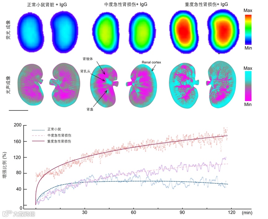 图3. (a)正常小鼠以及不同程度急性肾损伤模型小鼠的IgG沉积情况。(b)通过SRCPT监测得到的代谢曲线。
