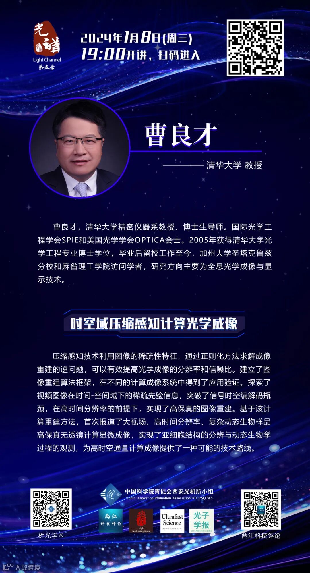 曹良才,清华大学精密仪器系教授、博士生导师。国际光学工程学会SPIE和美国光学学会OPTICA会士。2005年获得清华大学光学工程专业博士学位,毕业后留校工作至今,加州大学圣塔克鲁兹分校和麻省理工学院访问学者,研究方向主要为全息光学成像与显示技术。