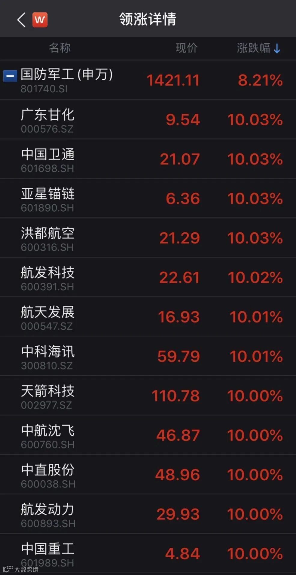 申万一级国防军工行业指数上涨8.21%,板块内中国卫通、洪都航空、亚星锚链、广东甘化、航发科技、航天发展等20多只个股涨停。