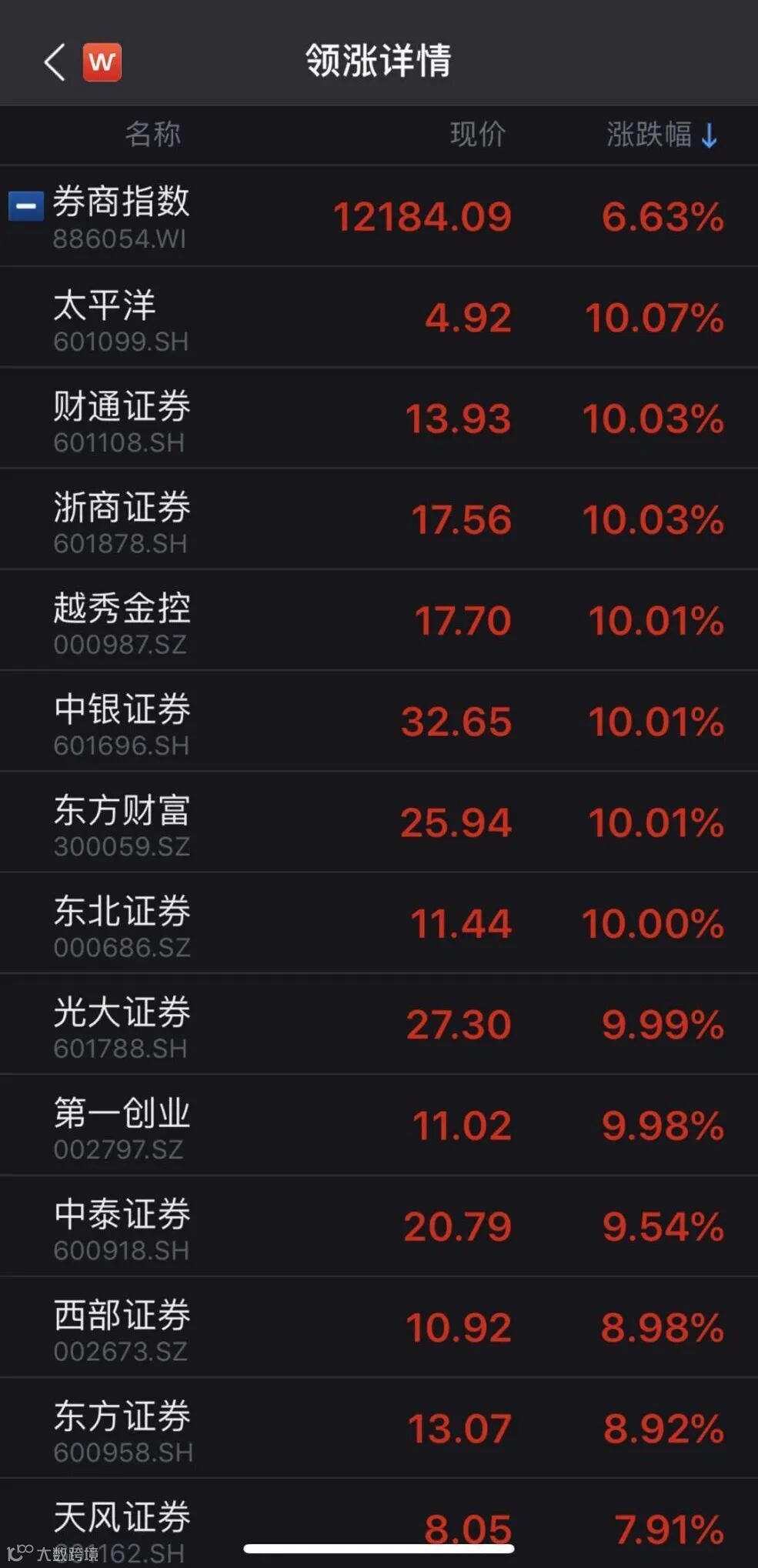 经过昨日的调整后,今日券商板块卷土重来,Wind券商指数上涨6.63%,板块成交额为1664.1亿元,仍维持较高水平。券商板块内,太平洋、财通证券、浙商证券、越秀金控、中银证券、东方财富等9股涨停,中泰证券上涨9.54%,西部证券、东方证券涨逾8%。