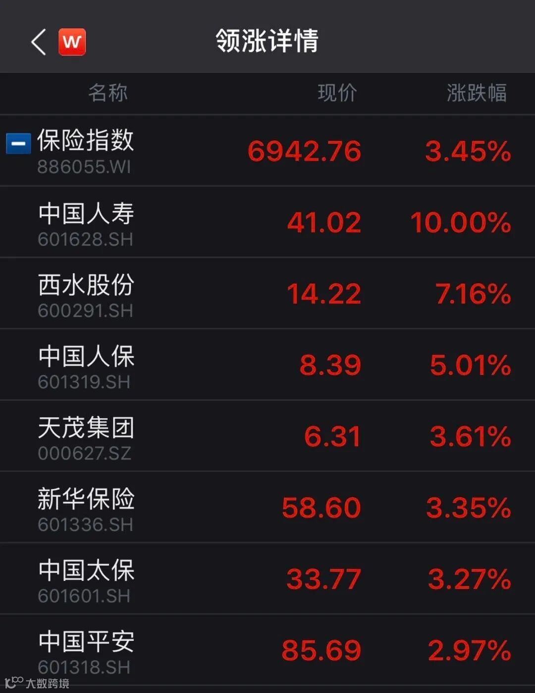 与此同时,保险板块也明显上涨,Wind保险指数上涨3.45%,板块内中国人寿涨停,西水股份涨逾7%,中国人保涨逾5%。