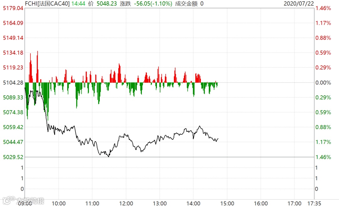 法国CAC40指数盘中跌近1.5%,此后涨幅逐渐缩窄。