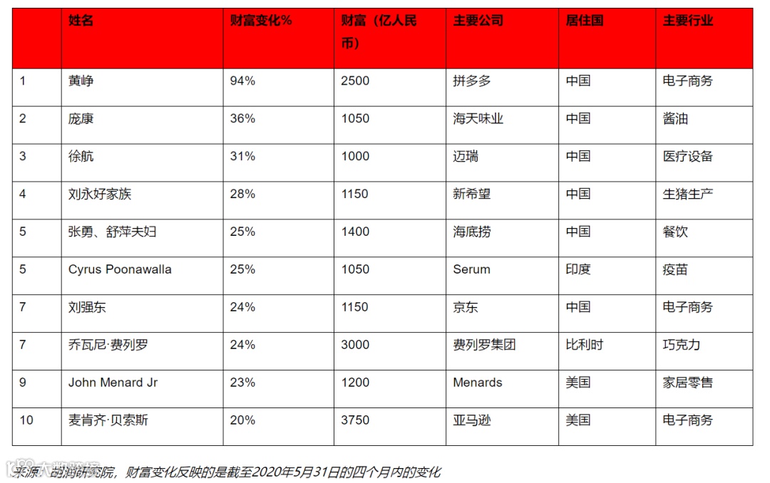 总体来看,在线电商、医药和零售行业成为大赢家。尽管全球企业家的财富在新冠疫情暴发的前两个月大量蒸发,但随后,他们的财富整体呈现V型复苏。