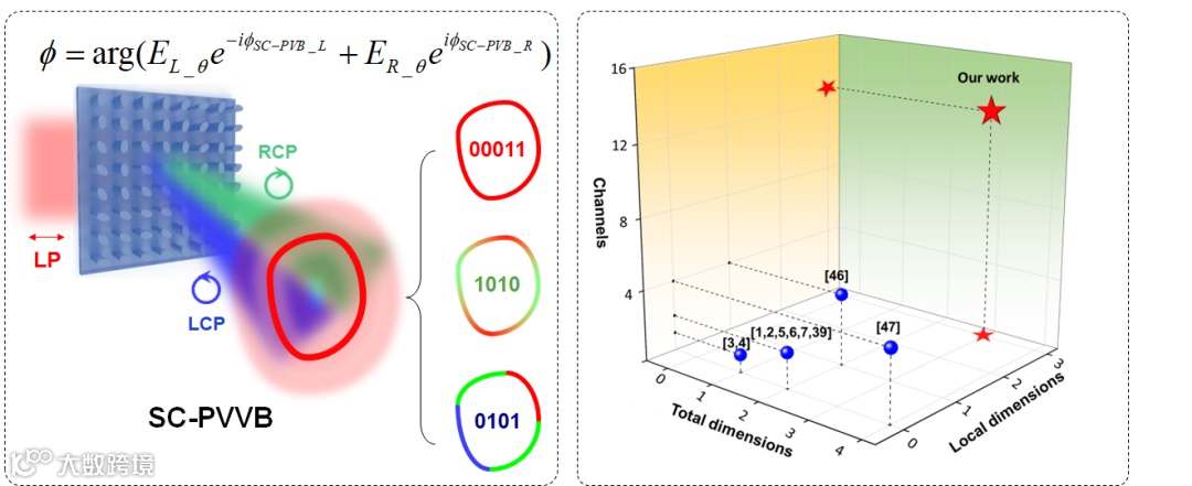 研究人员提出了多维信息传输方案,该方案利用优化的Dammann光栅实现了对SC-PVVB的精确控制。通过在Dammann光栅的每个衍射级次中引入优化的相位调制,可以独立设计每个衍射级次的光场,从而实现对光束形态、偏振和相位的精确操控。这种多维调制能力可以在一个超构表面样品中编码大量的信息,极大地提高了数据传输的效率和安全性。