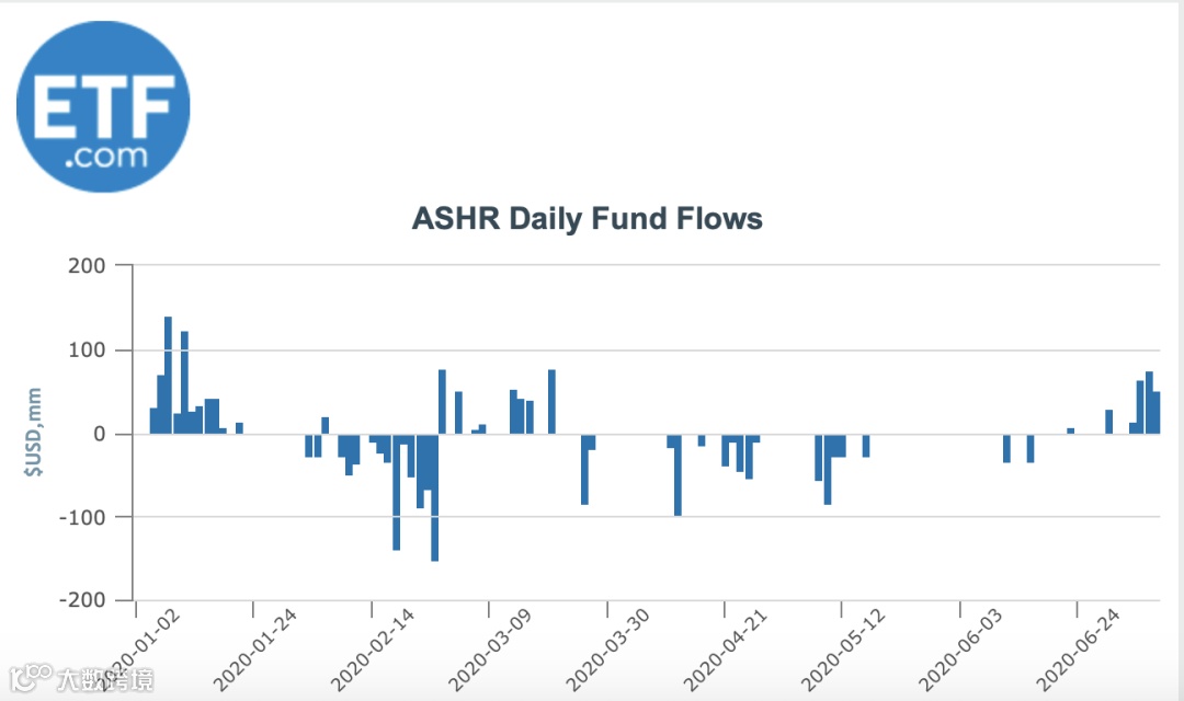 在海外发行的跟踪沪深300指数ETF ASHR上周一周净流入1.97亿美元。这只ETF最新规模为17.6亿美元。自基金2011年成立以来,一周净流入1.97亿美元是比较少见的情况。