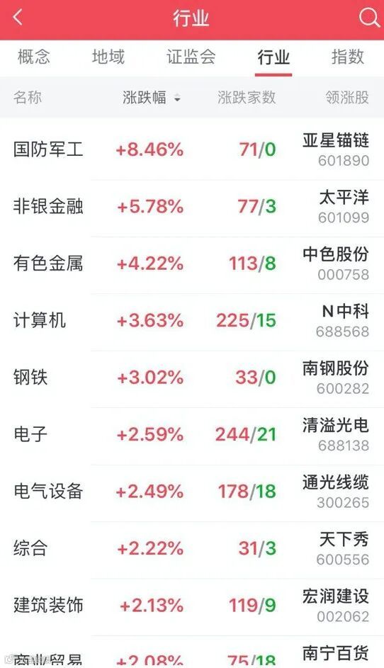 光大证券行情数据显示,从行业涨幅排名来看,非银金融、有色金属、钢铁全天涨幅分别达5.78%、4.22%和3.02%,分列行业涨幅的第二、第三和第五位。
