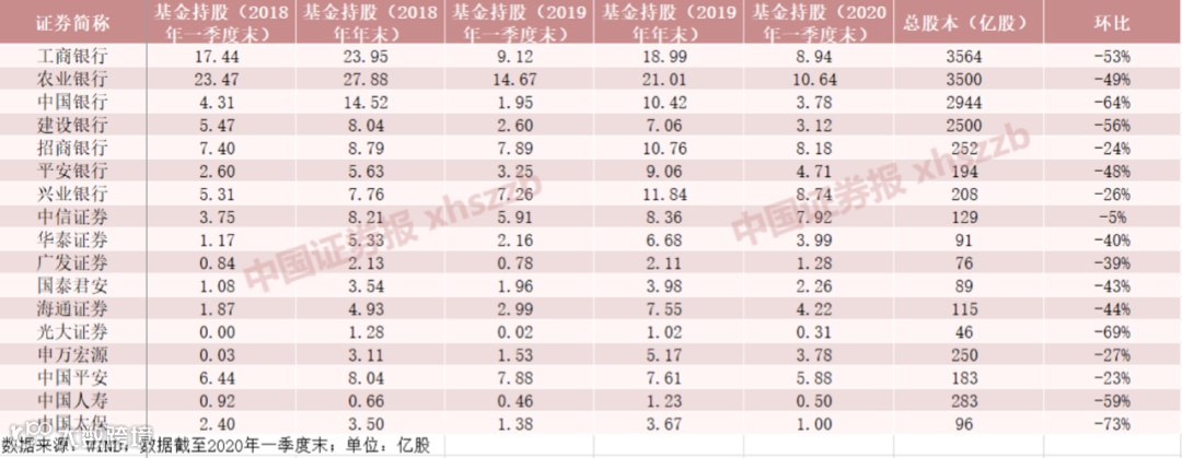 券商股方面,公募机构对华泰证券、广发证券、国泰君安、海通证券等四大头部券商一季度末的持股数量,环比分别大幅下滑了40%、39%、43%和44%。