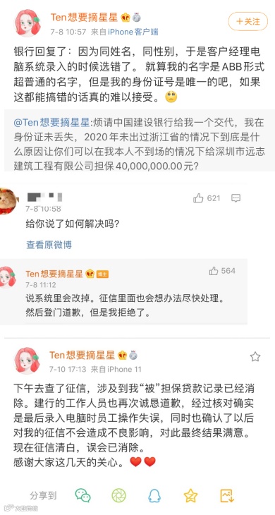 7月7日,一位名叫“Ten想要摘星星”的微博网友喊话建行称,因买房需要个人征信报告,当天下午两点,她前往中国人民银行查询征信。结果吓一跳,这名网友名下竟然莫名多了4000万的贷款担保!