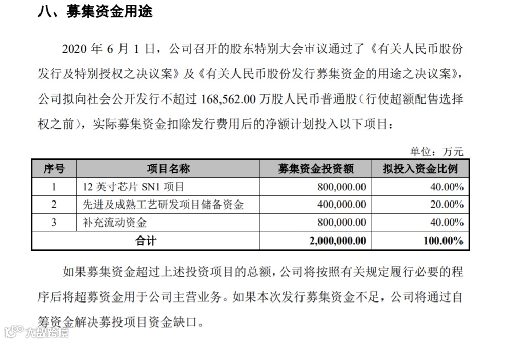 本次发行公司拟募资200亿元人民币,主要用于12英寸芯片SN1项目、先进及成熟工艺研发项目储备基金,另外有80亿资金拟用于补充流动资金。