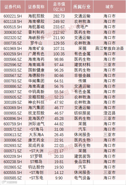 Wind数据显示,海南共有31家A股上市公司。从行业分布看,医药行业公司家数最多。从市值占比看,交通运输行业市值占比最高。此外医药、农林牧渔行业市值占比也较高。