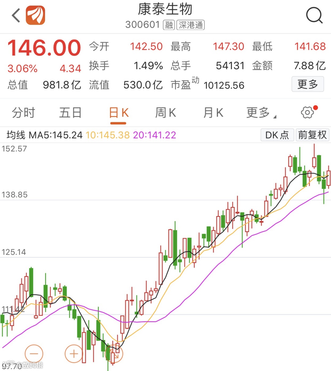 今年以来,康泰生物股价已涨近70%,总市值981.84亿元,接近千亿市值。