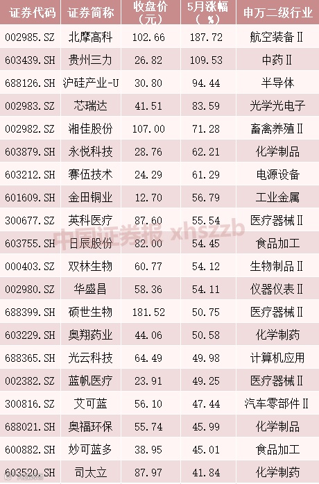 Wind数据显示,剔除未开板以及5月上市新股,5月两市有31只个股涨幅超50%。