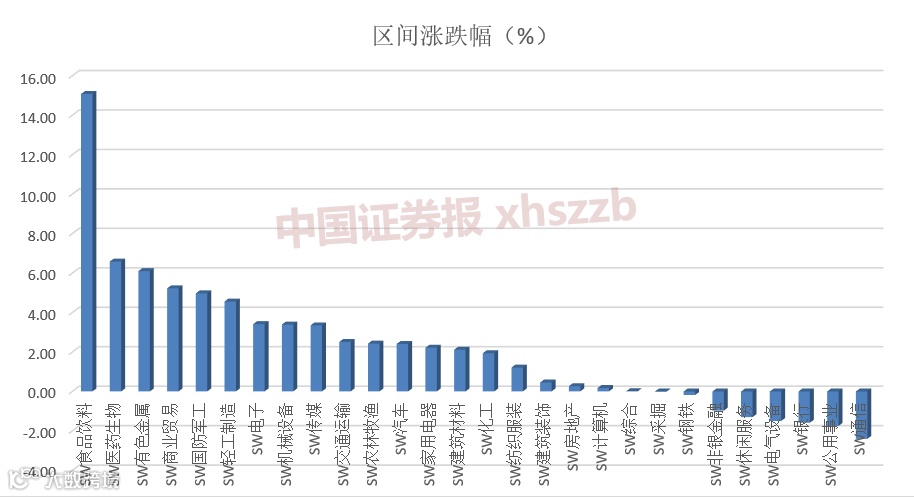 以算术平均法计算,申万一级行业中,食品饮料、医药生物、有色金属三板块涨幅居前,分别为15.07%、6.58%、6.10%。