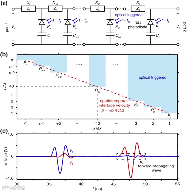 快速调制的可重构微带传输线可以模拟介质折射率的突变。为了证明广义相干波调控的可行性,文章使用快速光电二极管开关控制的微带传输线模拟时空体系,用于演示高斯脉冲在时空动态边界上的散射。前向入射波和后向入射波分别从端口1和端口2接入。在微带传输线中利用广义相干波调控实现无透射的仿真结果如图4(c)所示,经过广义相干波调控后,前向传输波可以被忽略。很显然,在微波频率上,文章提出的广义相干波调控完全可以抑制时空界面出现的透射波。