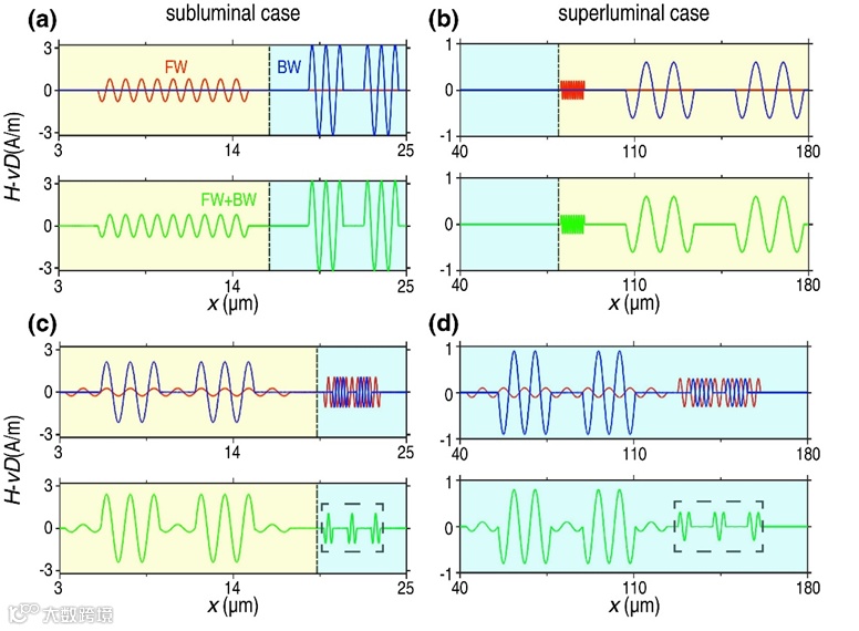 图3. 广义相干波调控产生高频脉冲。(a,c)((b,d))亚光速(超光速)情况下,广义相干波调控前后的场分布。