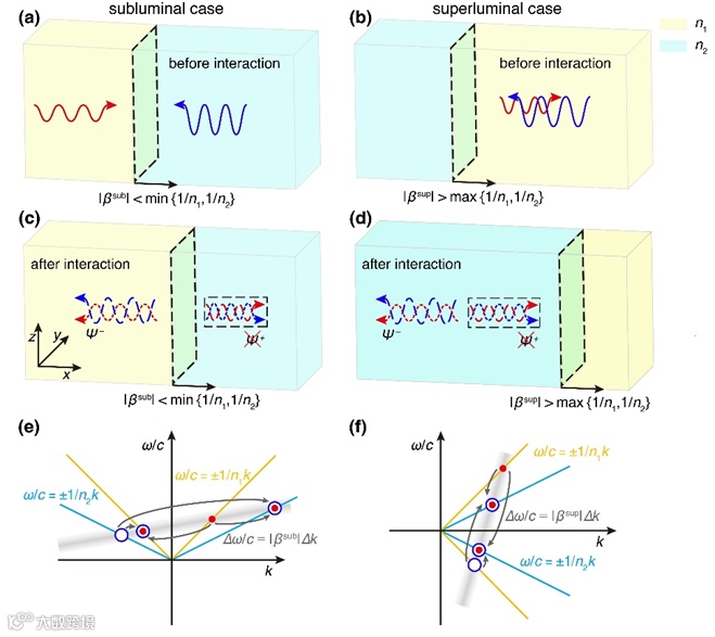 图1. 动态界面上广义相干波调控的示意图。(a, c)((b, d))入射波与亚光速界面(超光速界面)相互作用前后,两个反向传输波的分布。(e, f)亚光速情况和超光速情况下,动量-能量体系下的模式跃迁示意图。
