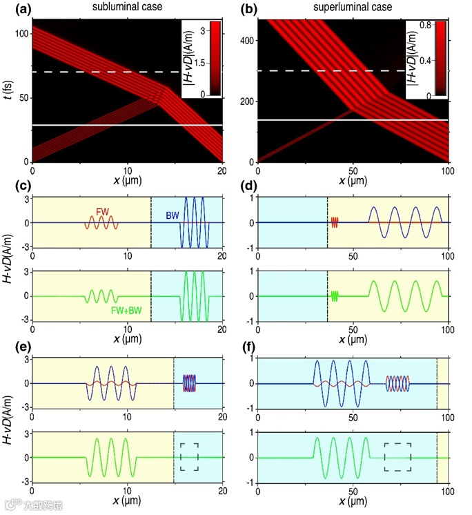 图2 时域有限差分法(FDTD)下广义相干波调控的干涉相消。(a,b)亚光速情况和超光速情况下的时空场图分布。(c,e)((d,f))两个反向传输波与超光速界面相互作用前后的场图分布。