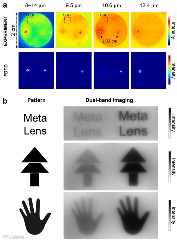 超透镜是一种基于亚波长结构设计的平面透镜,通过亚波长结构的排列组合灵活操控光波的相位、幅度或偏振,可以实现光的精确聚焦和控制。这种技术使得超透镜具有紧凑的尺寸、设计灵活性和对不同光谱的高效控制能力。本工作中的双波段超透镜采用了纳米结构空间复用的设计方法,在单个孔径内编码了两种薄透镜的相位分布。如图2所示,当宽带光通过超透镜时,它对不同波长的光分量施加了特定的调控。这两个等效透镜具有相同的聚焦距离,但在离轴方向上具有不同的对齐位置(+x₀ 和 -x₀),从而在单个红外传感器的不同区域上形成两个相邻的图像。基于一对输入图像,计算两幅输入图像中对应像素的强度比值,然后通过插值确定相应的温度值,即可生成最终的热成像图。