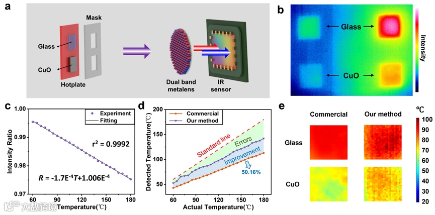 本工作在实验上测量了温度与强度比之间的关系曲线,并对低发射率物体进行了比色热成像,实验装置如图4(a)所示。由于发射率的差异(玻璃:0.9,CuO:0.51),尽管两片薄片的温度相同,其热图像的亮度却显著不同。研究者选用具有高且稳定发射率的玻璃作为黑体,通过测量其在不同温度下的强度比,绘制出可用于比色测温的标定曲线,标定曲线表现出显著的线性关系。由于低发射率的影响,在未设定发射率参数的情况下,商业红外相机测得的CuO温度与实际温度存在明显偏差。本工作通过比色测温法对CuO进行测温,校正后的温度结果如图4(d)中的紫色曲线所示。采用比色方法后,测得的温度曲线与标准曲线更加吻合。进一步计算测量曲线与标准曲线之间的面积(误差程度)发现,在60至180摄氏度的温度范围内,平均误差减少了50.16%。