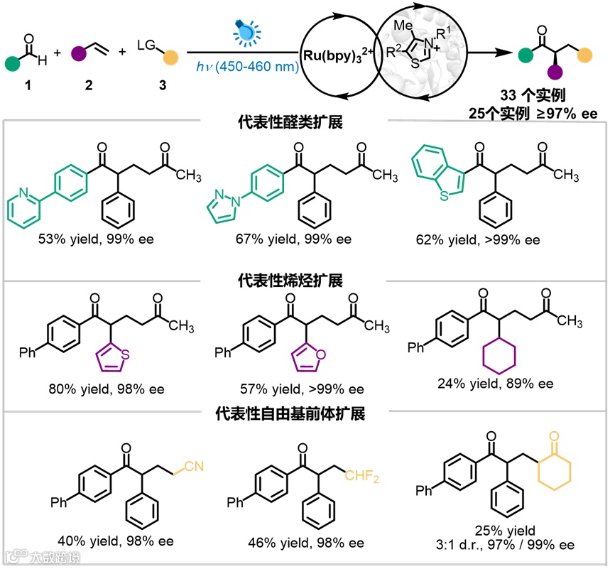 针对这些难题,黄小强团队利用可见光激发和定向进化手段,将苯甲醛裂解酶“重塑”为三组分自由基酶(3CRE),实现了一例非天然的高对映选择性的三组分自由基偶联反应,并且结合机理实验解析了这一新功能的化学机制。该体系能够组合三个可变的底物,极大丰富了光生物合成的多样性,是光酶领域的一个标志性成果(图1)。