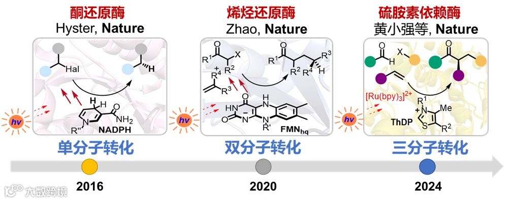酶是自然界的催化剂,在生命体系的多种生理过程中发挥关键作用,也是基础研究和生物制造等应用领域的重要工具。然而,天然酶催化功能相对有限,无法满足当下的需求。比如,自然界中复杂化合物的多组分合成往往需要多个酶的共同催化。尽管近年来酶催化获得了巨大的发展,但是目前发展的酶促反应多是单分子或双分子转化。如何抑制自然选择的酶天然反应性、利用一个蛋白调控三个不同底物/化学中间体的有序转化,仍然具有很大的挑战性。