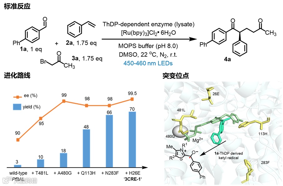 团队选取4-苯基基苯甲醛(1a),苯乙烯(2a)和溴丙酮(3a)作为模板底物,探索了[Ru(bpy)3]Cl2•6H2O和ThDP依赖酶的催化体系。随后通过分子动力学模拟和半理性的迭代位点特异性突变策略对酶进化改造,团队发现T481L,A480G位点突变对反应的对映选择性有一定提升,Q113H,N283F位点对反应的收率有显著提升,最终通过五轮突变获取了最优的突变体(图2)。