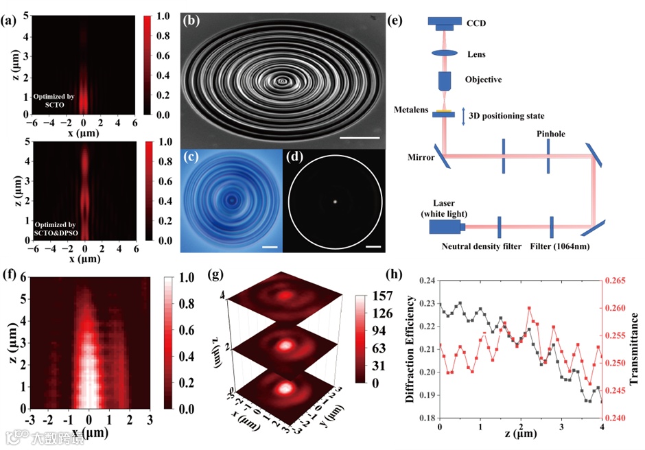 图2. 延长焦深高NA超透镜。a. 电场强度分布的模拟结果;b. 透镜的扫描电子显微镜图像; c. 明场光学显微镜图像;d. 暗场光学显微镜图像;e. 测量装置示意图;f. 实验测得的光强分布;g. 以2μm步长呈现的三维堆叠光强图像;h. 测量得到的透镜透射率和衍射效率