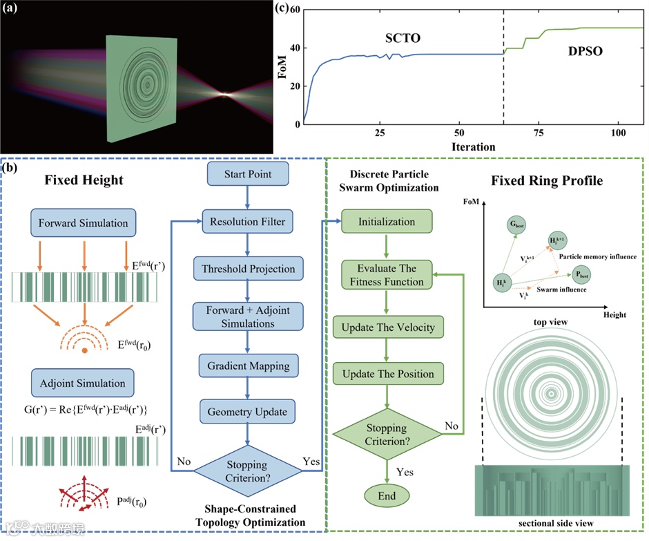 图1. 结合形状约束拓扑优化和离散粒子群优化的混合逆向设计框架。a. 多功能超透镜示意图;b. 协同优化算法流程图;c. 优化过程