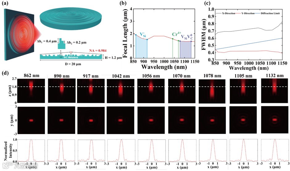 此外,研究人员还设计一种高NA且偏振不敏感的宽带消色差超透镜,实现在850 nm至1150 nm波长范围内保持一致的焦距,有效抑制了色差。SiC支持光学可寻址的长寿命自旋量子比特,其发光色心包括硅空位(