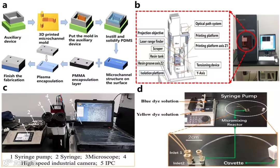 图5.(a)微混合器制造工艺流程图;(b)PμSL微尺度3D打印系统及设备主要部件;(c)实际混合实验装置;(d)实验过程中微混合器的放大视图。