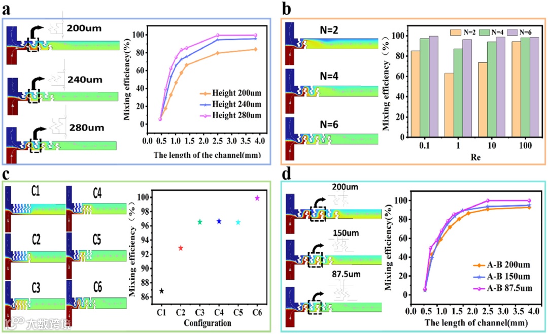 图3. 四种结构参数对PWFB微混合器混合效率的影响。